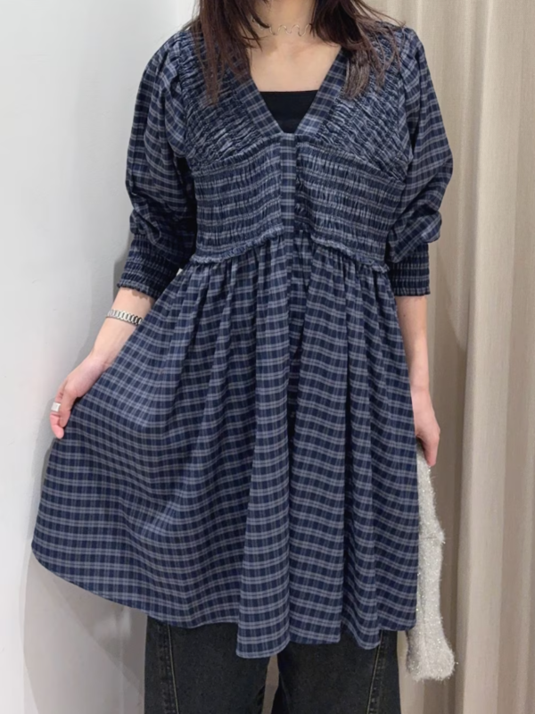 2WAY抽褶縫格紋迷你洋裝
