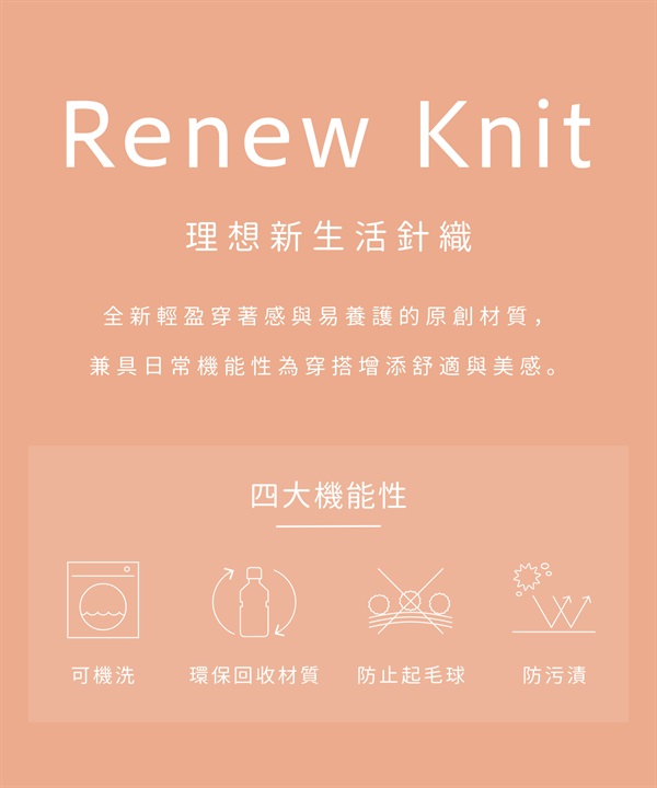 輕盈好穿又帶有洗鍊感的原創材質。防汙、不易起毛球且可機洗的機能性,洗滌保養更輕鬆省事。