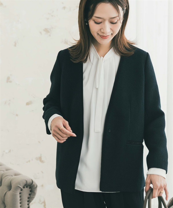 粗花呢V字無領長版西裝外套