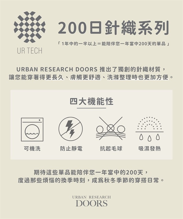 可機洗、防起毛球、防靜電、吸濕發熱機能的高機能材質單品,能陪伴您一年當中的200天。