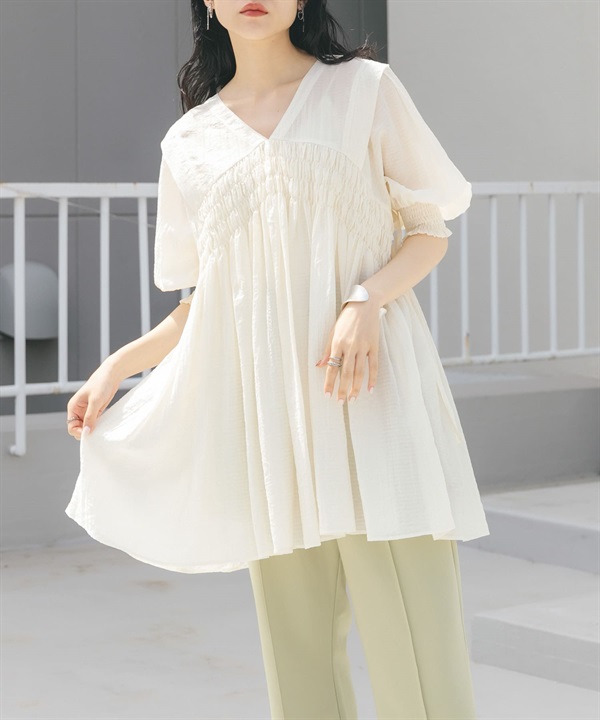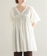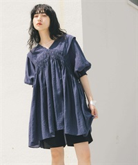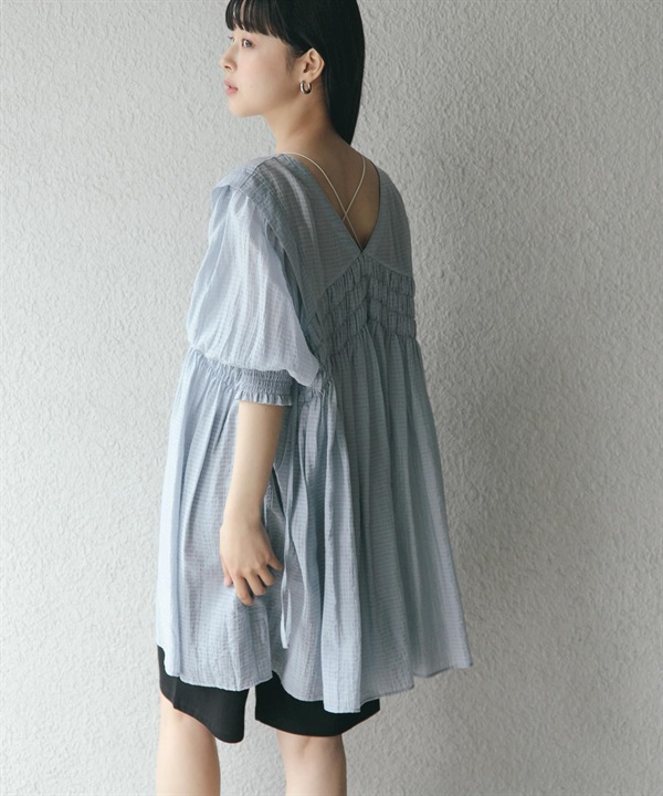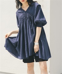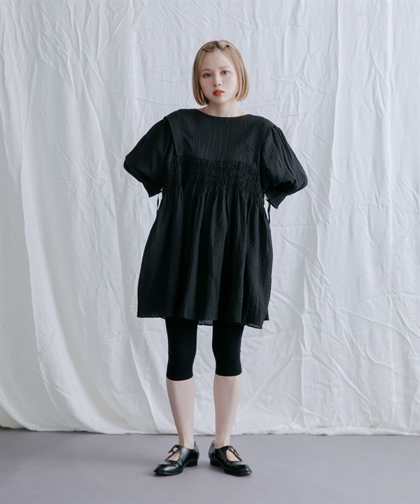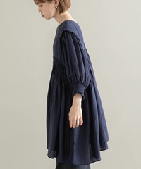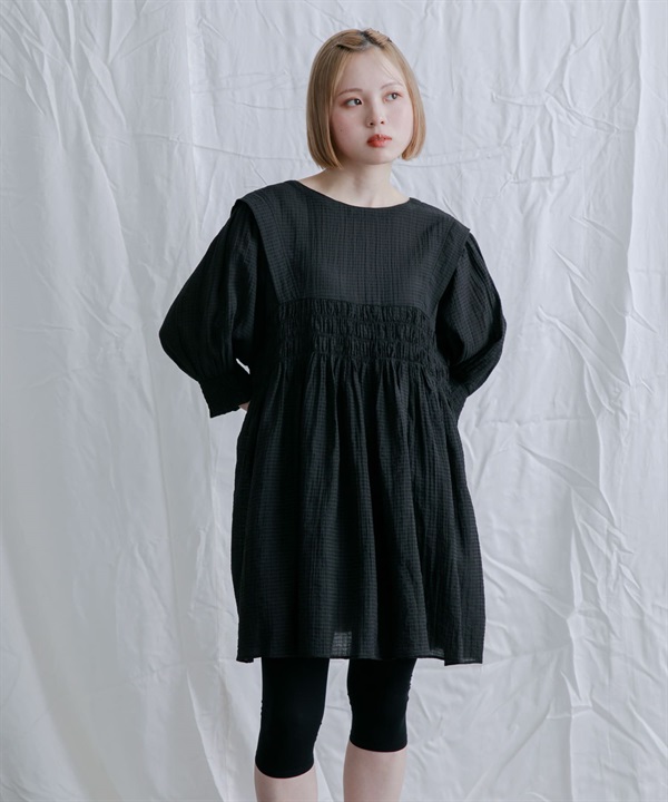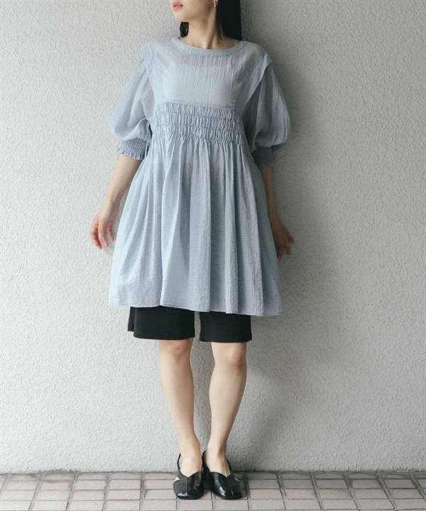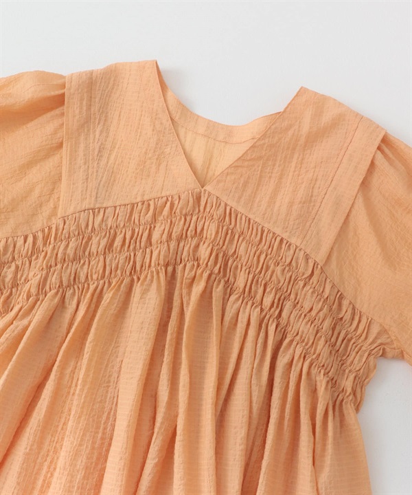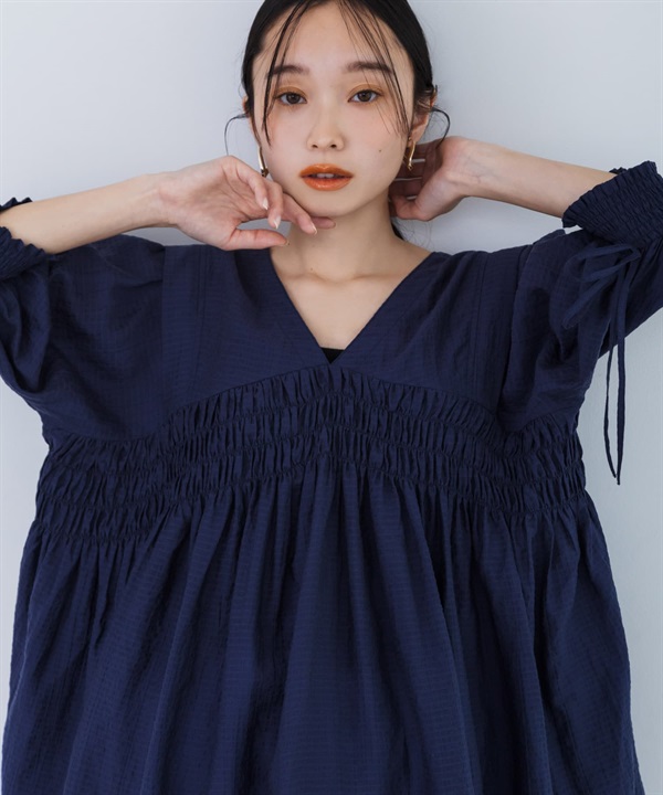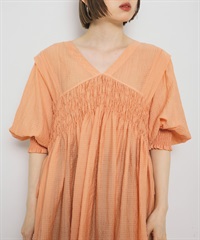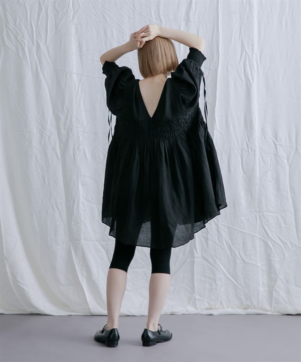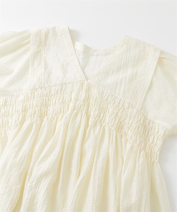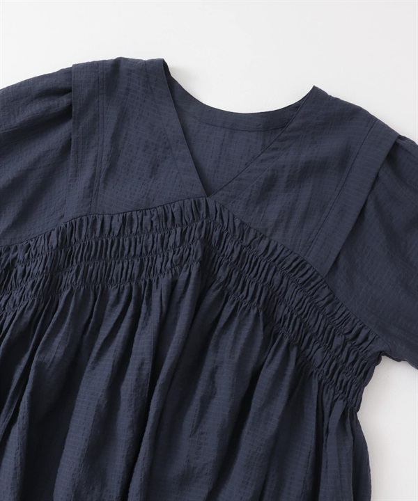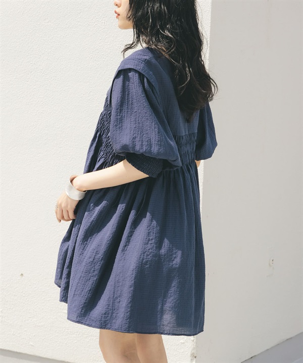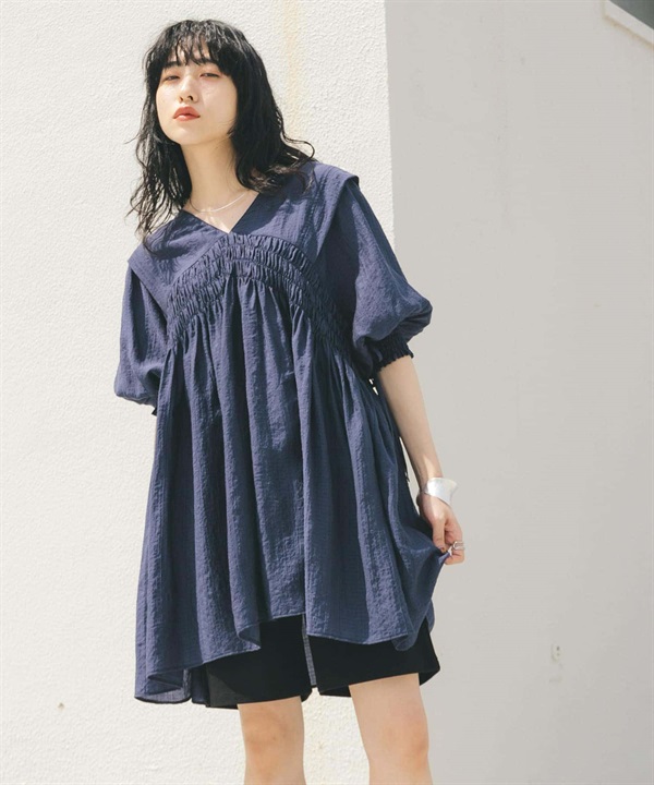 胸前抽褶縫設計為特色的迷你洋裝。肩部打褶設計很俐落,略寬鬆的剪裁自然達到修飾效果。柔美蓬鬆線條,表面紋路感的透膚材質,今夏必備的百搭洋裝。