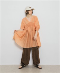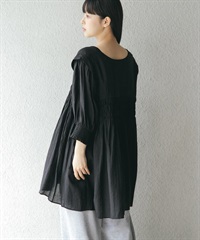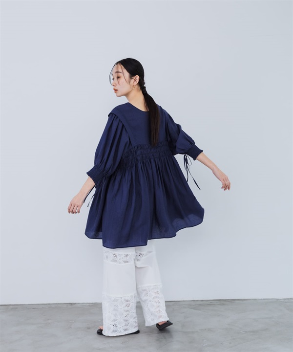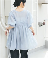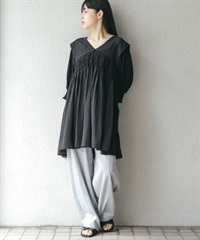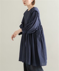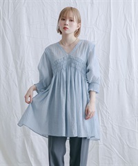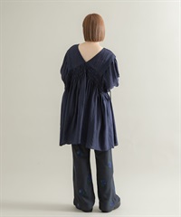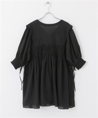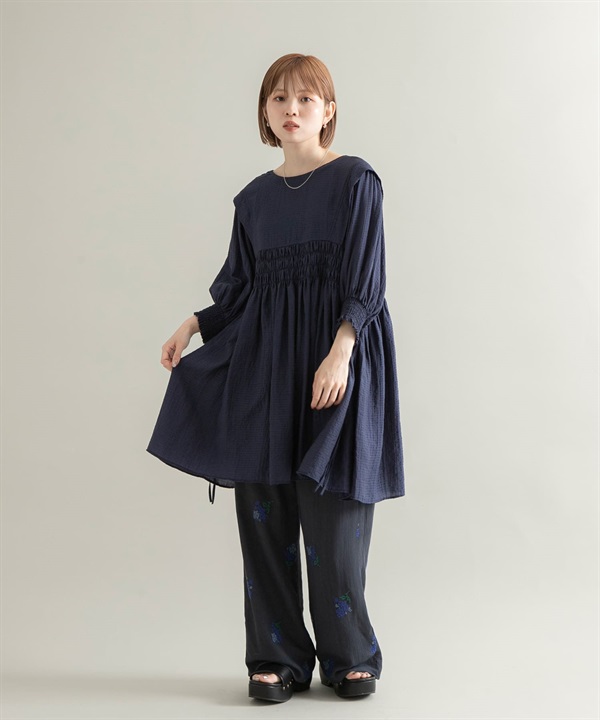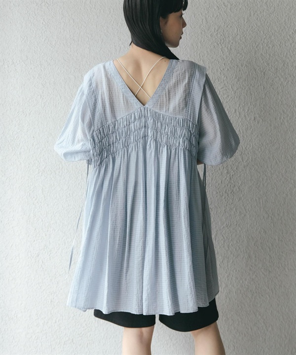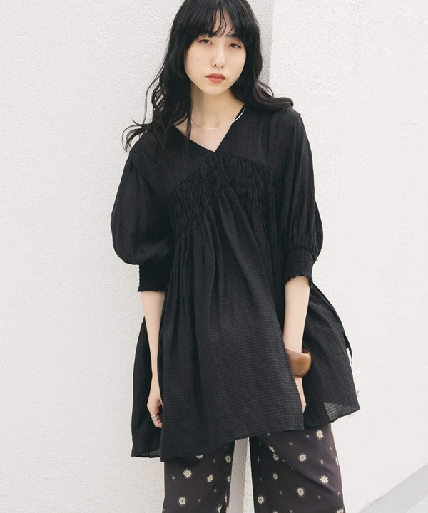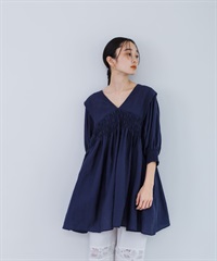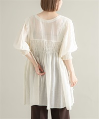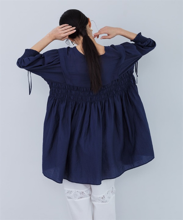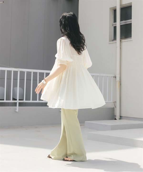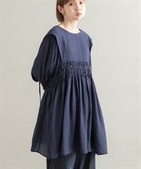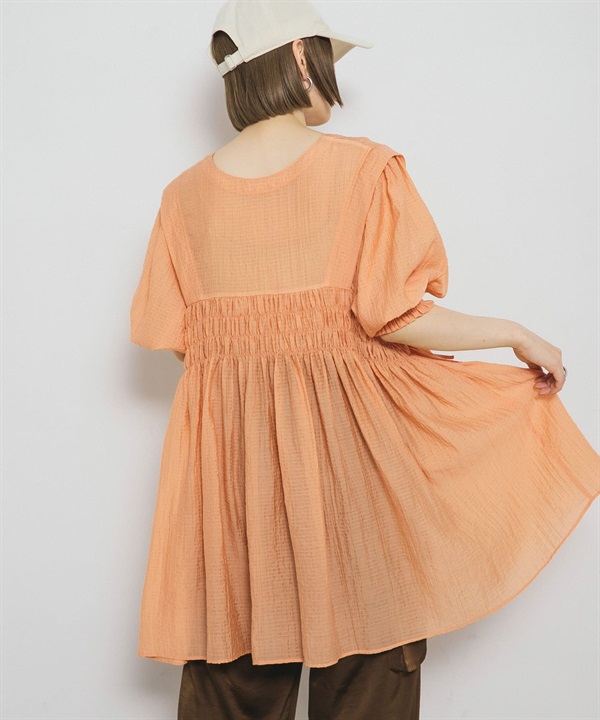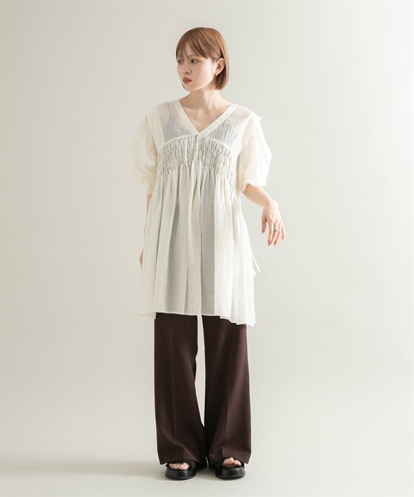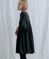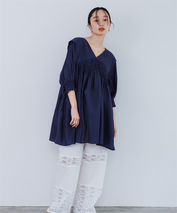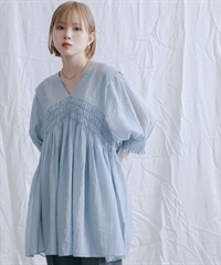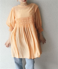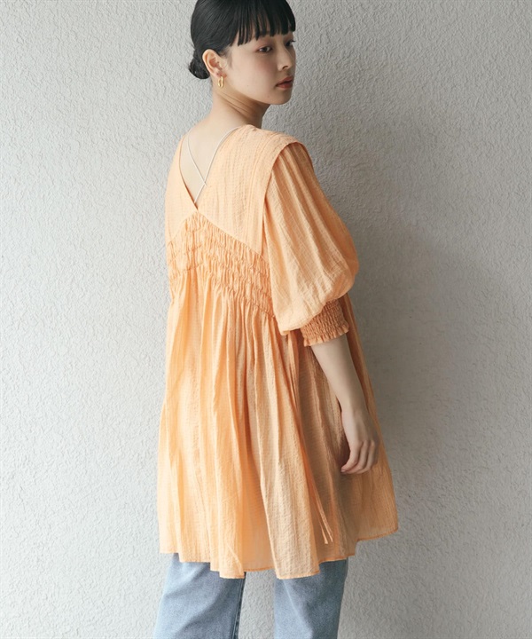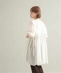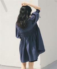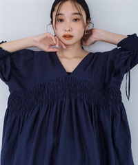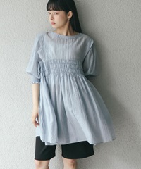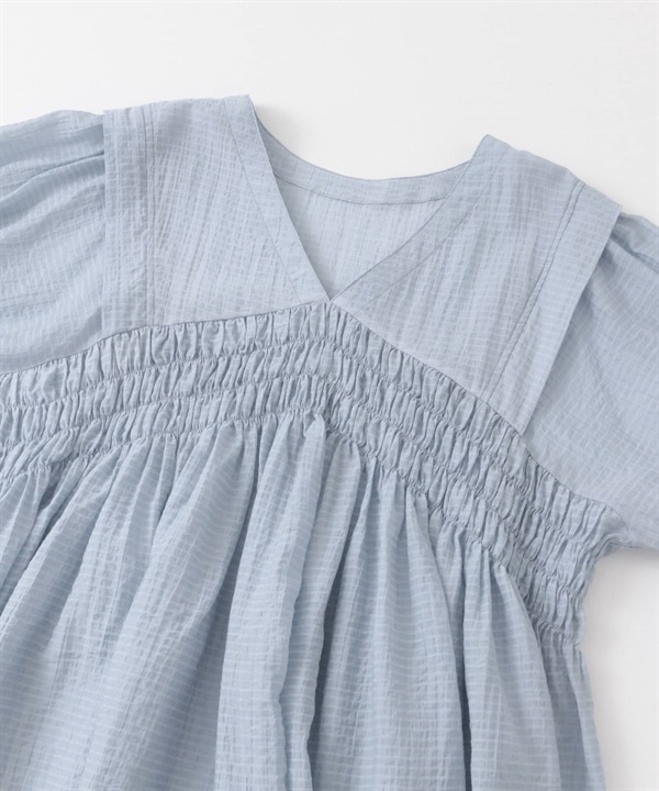 胸前抽褶縫設計為特色的迷你洋裝。肩部打褶設計很俐落,略寬鬆的剪裁自然達到修飾效果。柔美蓬鬆線條,表面紋路感的透膚材質,今夏必備的百搭洋裝。