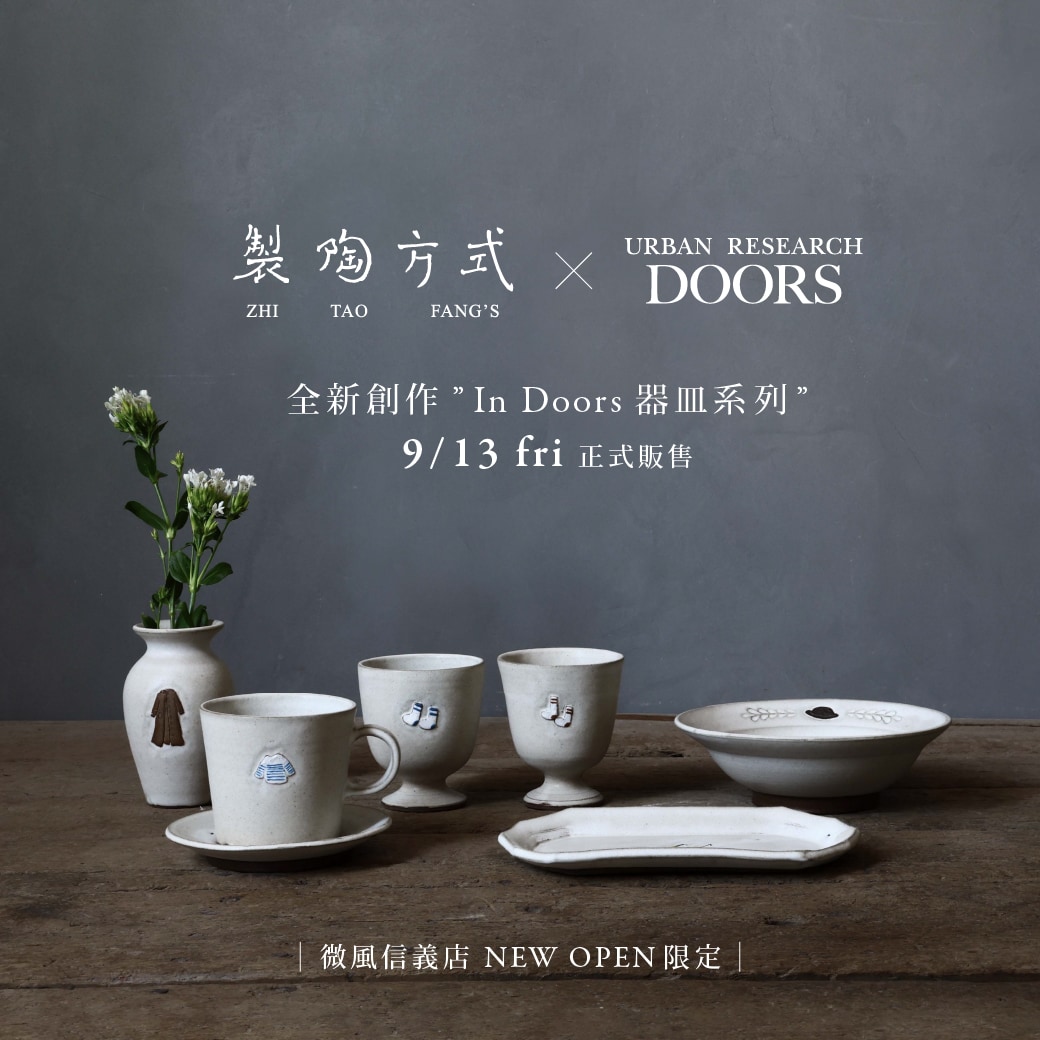 為慶祝DOORS微風信義店開幕,邀請到知名陶藝品牌【製陶方式】合作推出聯名陶藝器皿。以DOORS簡約、舒適的品牌風格為設計概念,將生活衣著與製陶方式的器皿設計結合,打造「In DOORS」限定系列,期待讓客人挑選器皿時,也能從中體驗服飾搭配的樂趣。