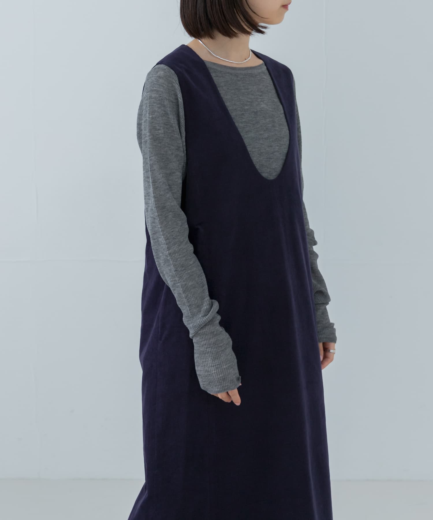 含羊毛的高級質感細肩帶洋裝,高腰設計修飾效果佳,可輕鬆隨氣溫變換內著,俐落優雅。