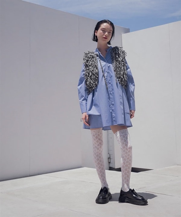 獨特的直條紋緹花材質,不易皺且帶蓬鬆感,立體的輪廓線條為一大特色,不分季節皆適穿。