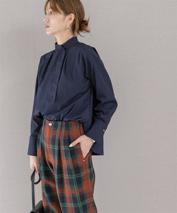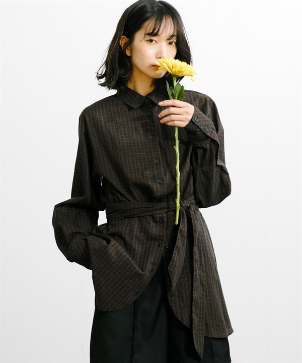 腰部打褶剪接格紋襯衫