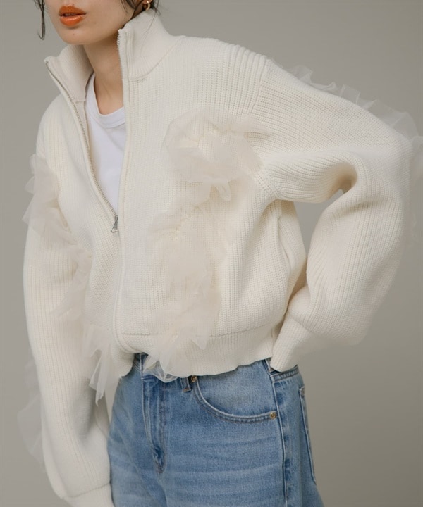 薄紗裝飾針織拉鍊夾克