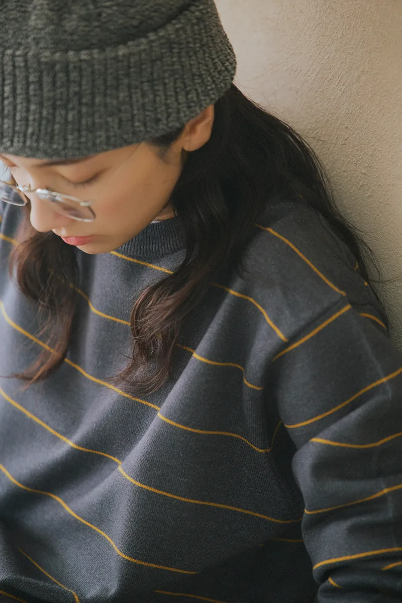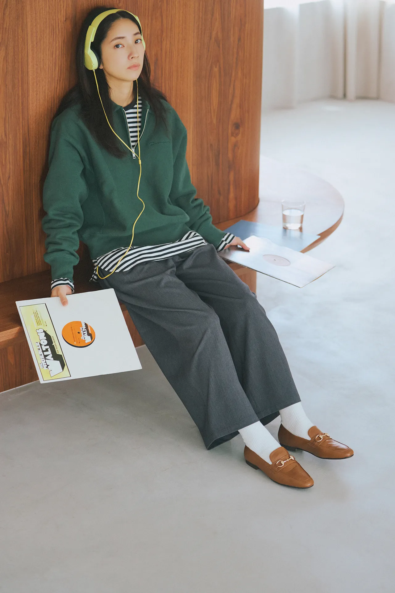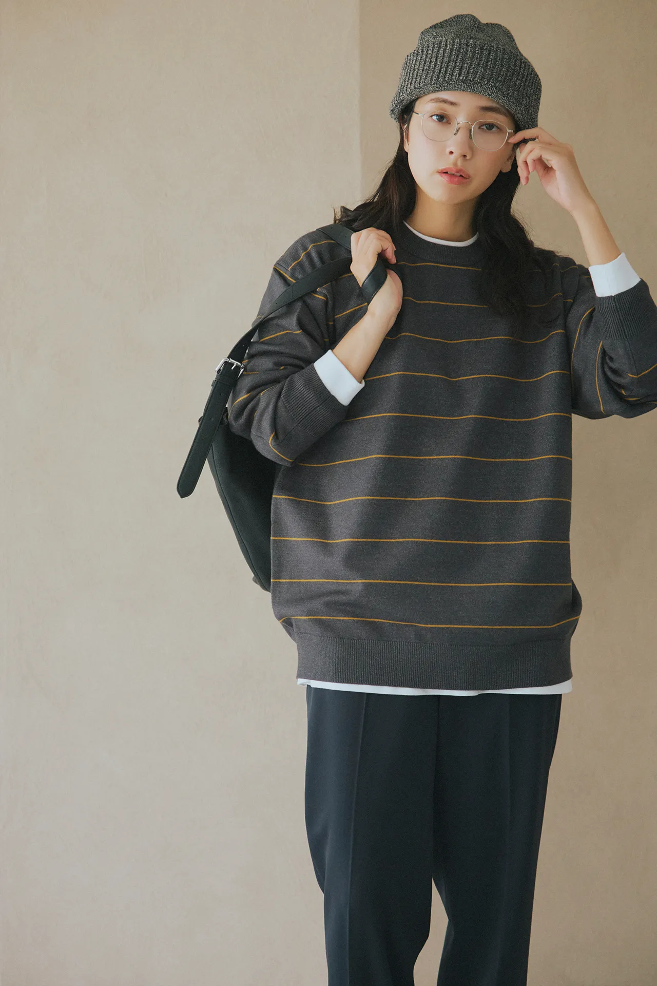 經典不敗的圓領針織推出全新條紋配色,搭配錐形長褲。類似羊毛材質的高級質感褲款,展現出乾淨俐落的氣質,讓休閒穿搭也能質感升級。