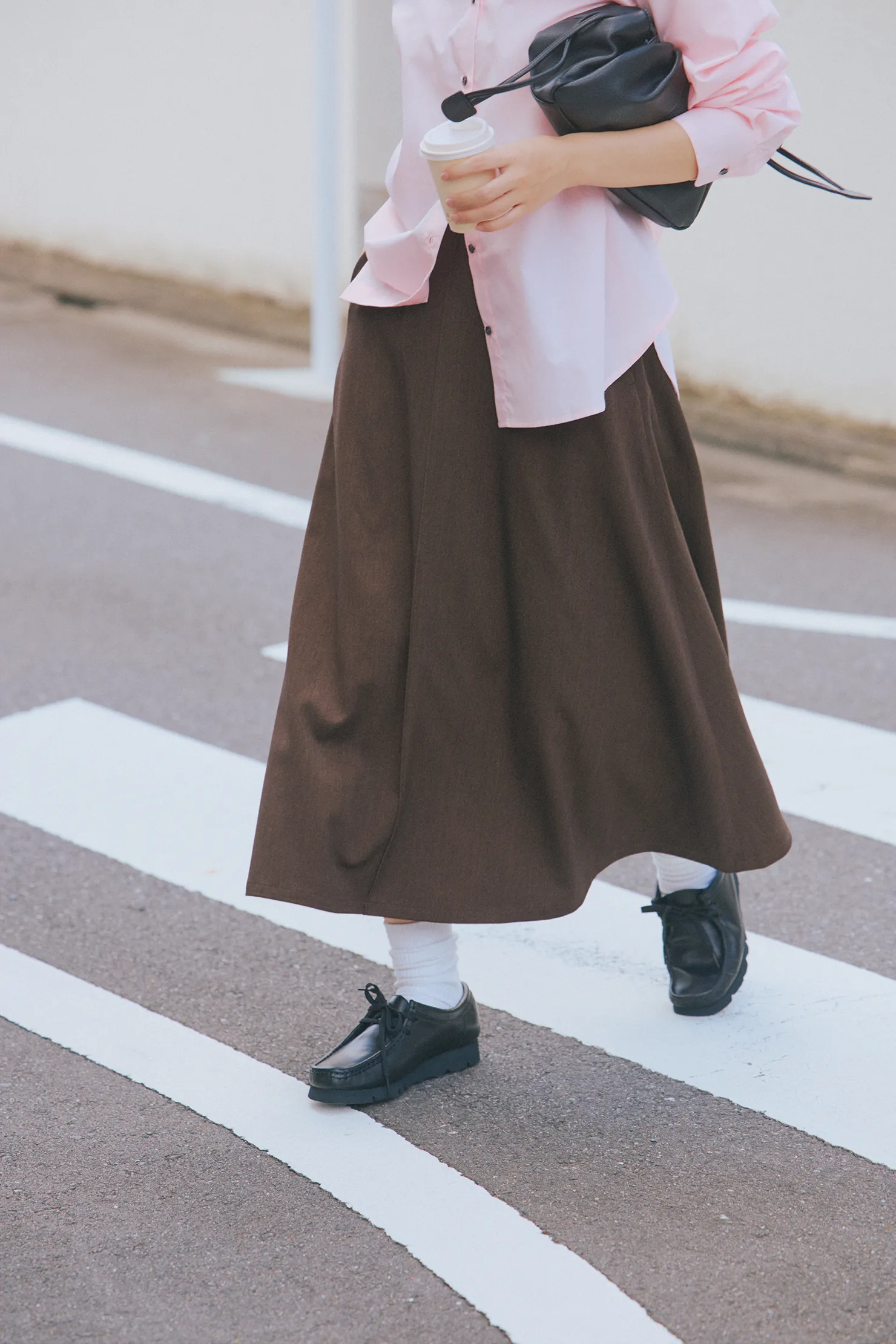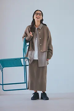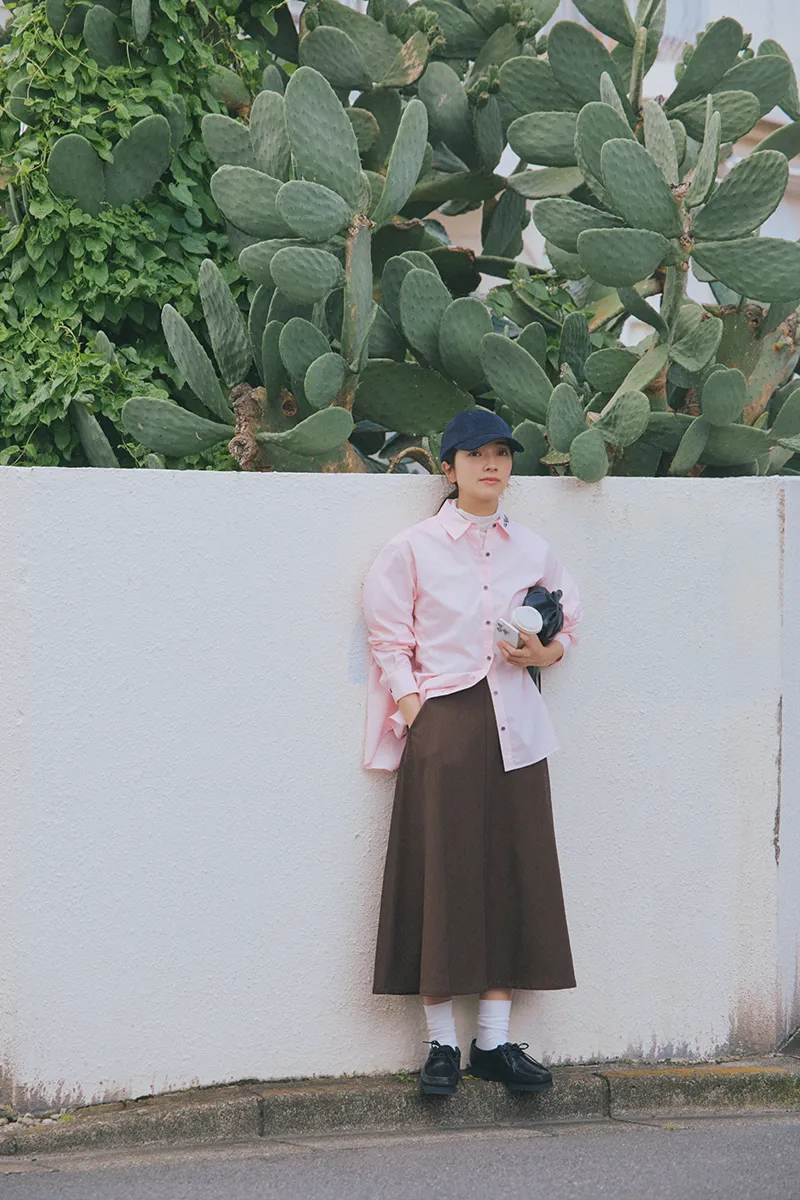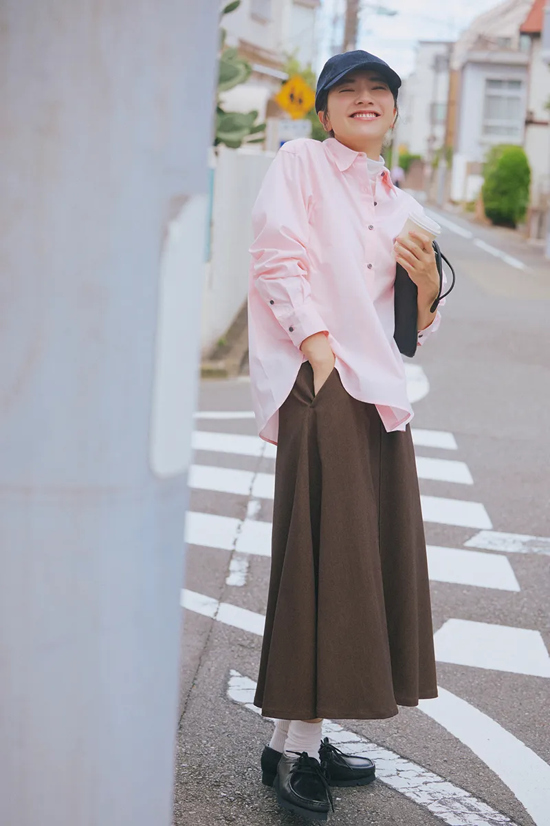 外出時的首選——完聲系列的傘狀裙。中央的壓褶線條強調縱向比例,帶來顯瘦效果。粉色 × 棕色的秋日色調組合,營造出季節感十足的搭配。