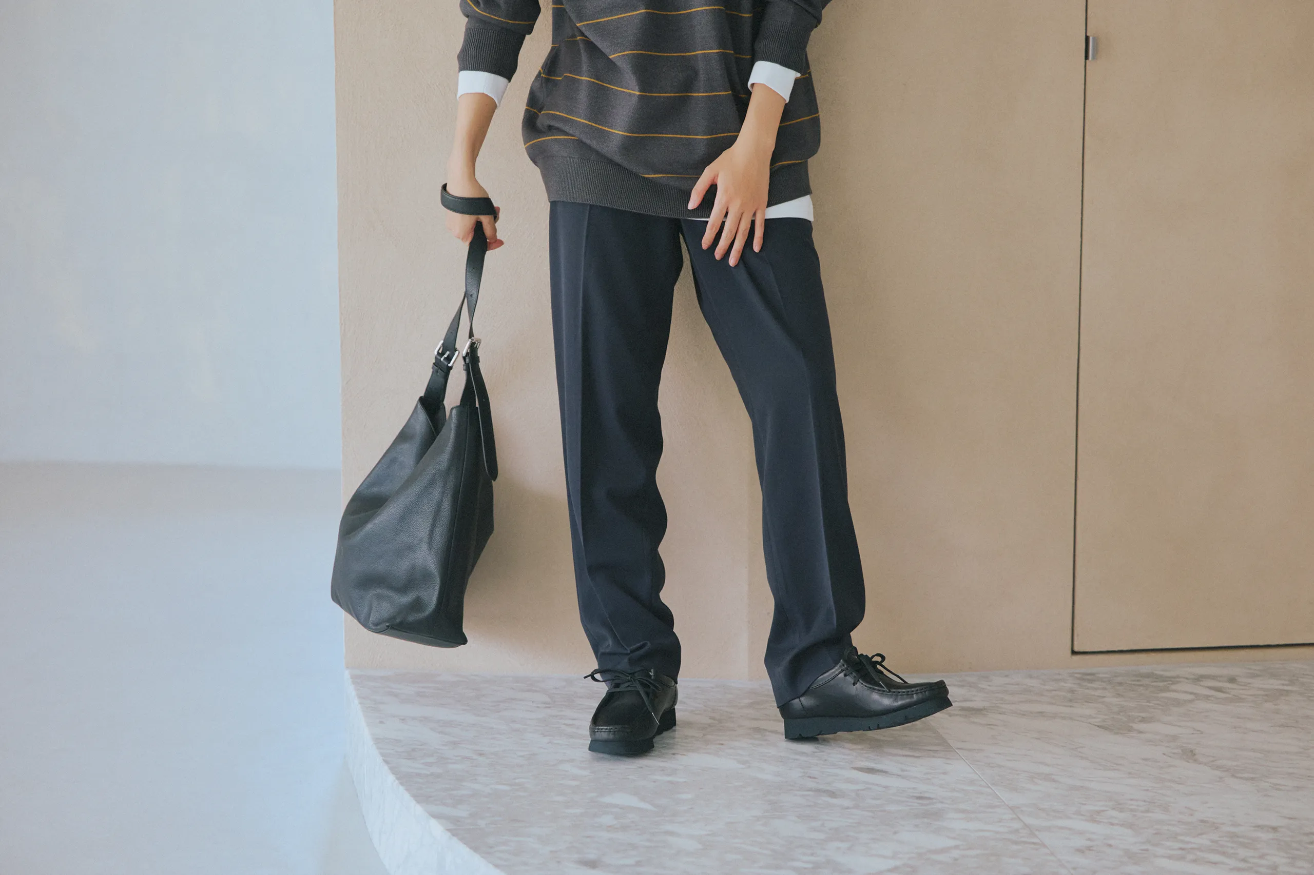 以帶有中性風格的造型來演繹九分寬褲。搭配防靜電機能,即使在乾燥季節中,也能保持舒適。不易起皺,非常適合正式場合的穿搭。