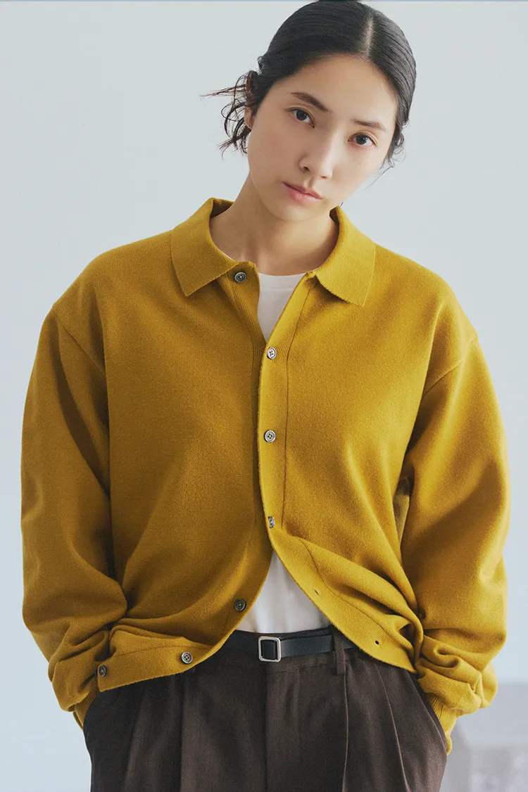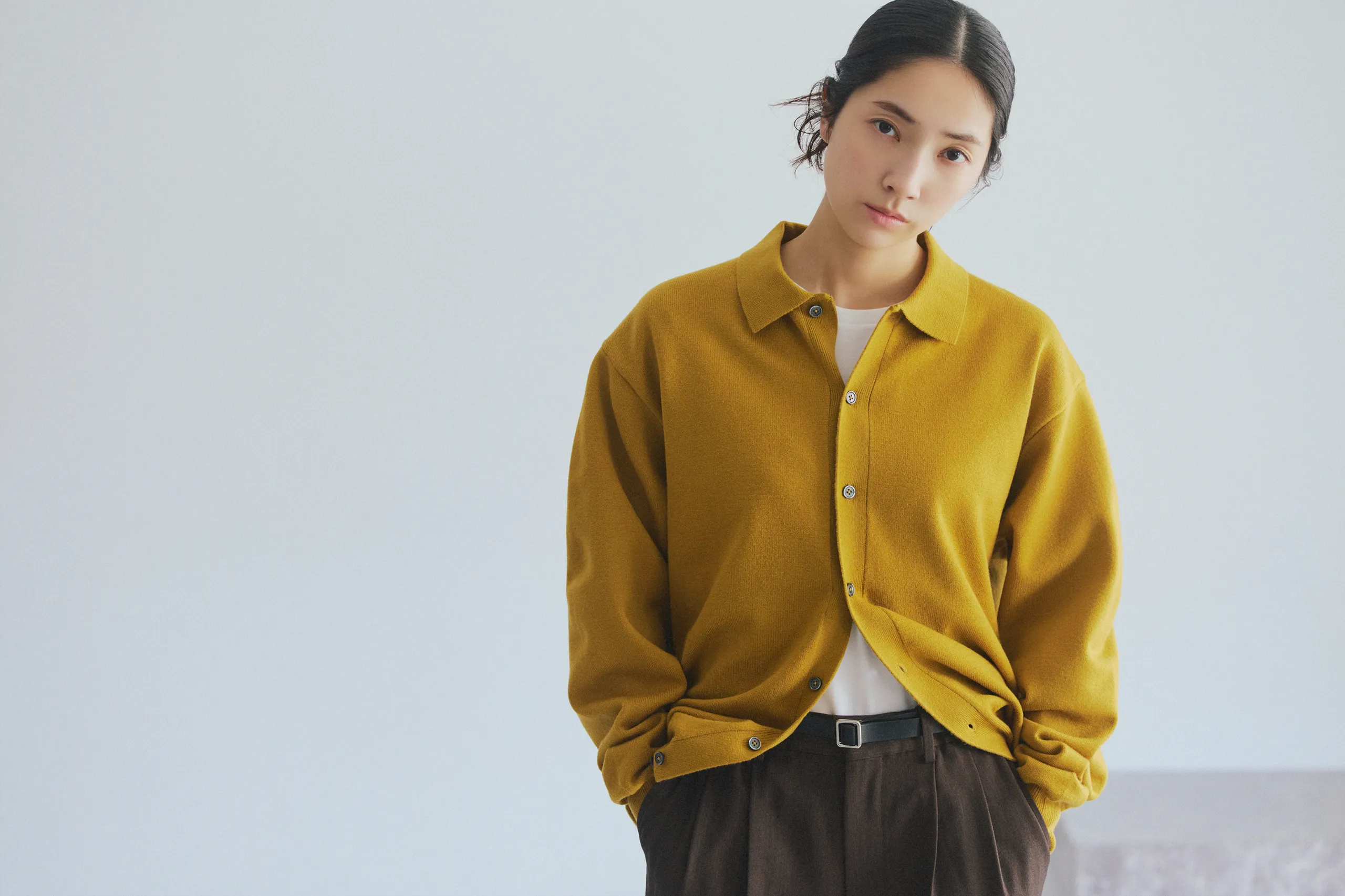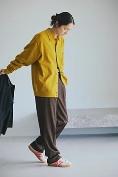 領口設計的 200日針織襯衫式開襟衫,寬鬆版型讓休閒穿搭更自在。搭配雙褶設計的寬鬆錐形長褲,整體比例恰到好處,展現利落感。