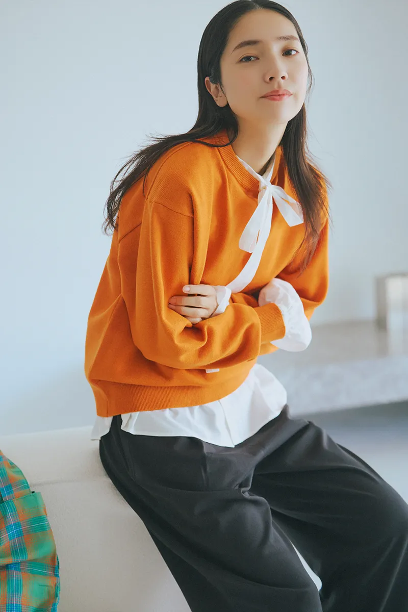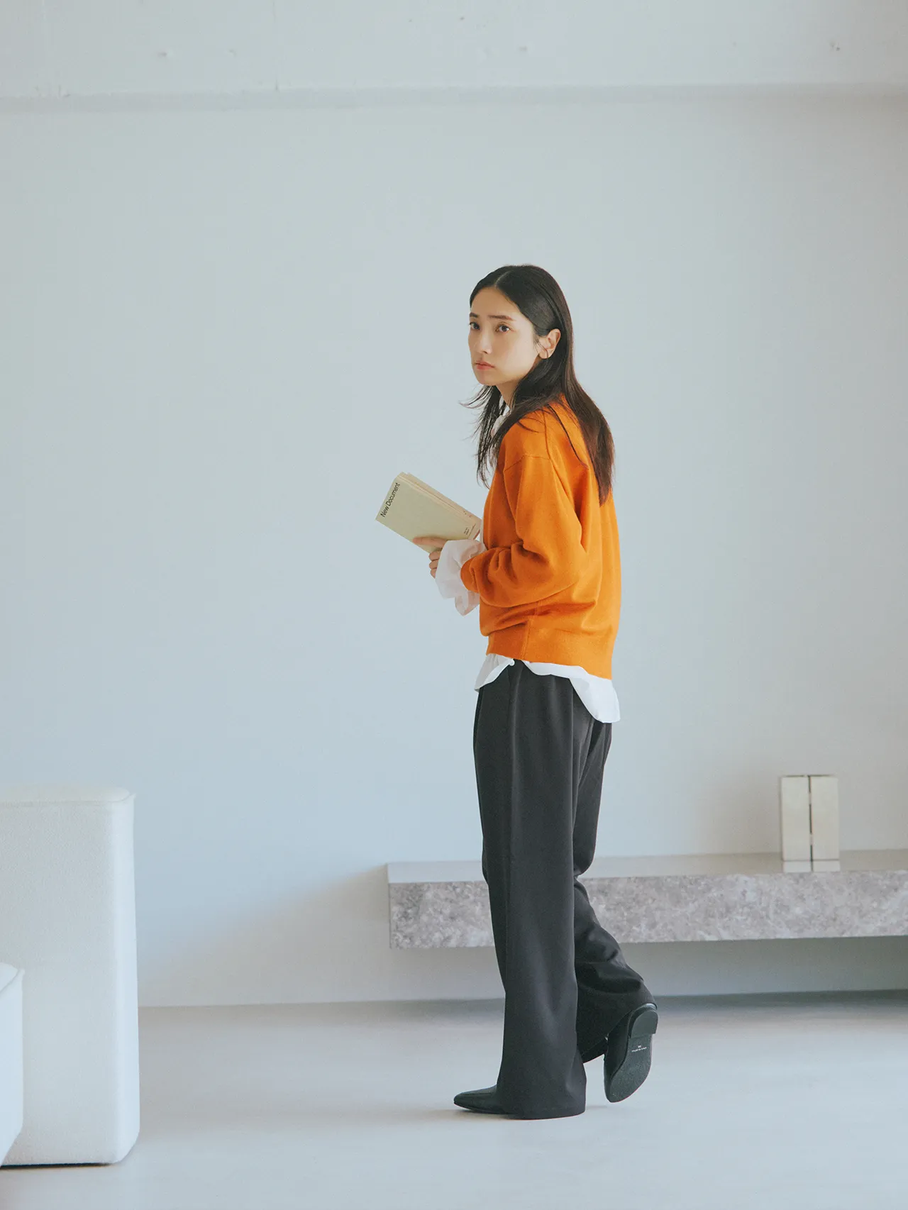 充滿活力的維他命橘色,搭配線條俐落的完聲輕鬆長褲,營造精緻俐落的造型。因設計簡約,讓內搭的荷葉邊襯衫若隱若現,更能享受層次穿搭的樂趣。